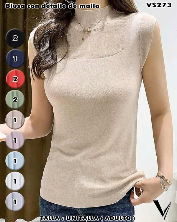 ➡️Blusa elegante y ligera con detalle de malla en el pecho. Diseño sin mangas y cuello alto, ideal para un look sofisticado.