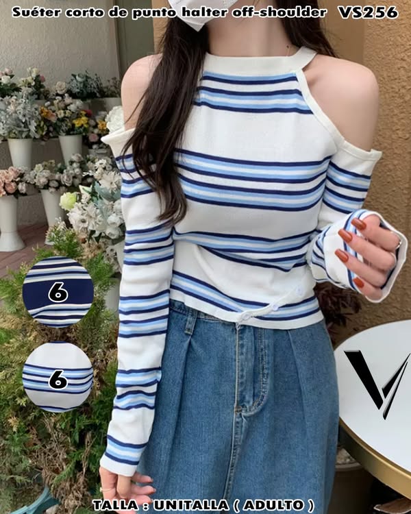 VS256 - Suèter corto de punto halter off-shoulder