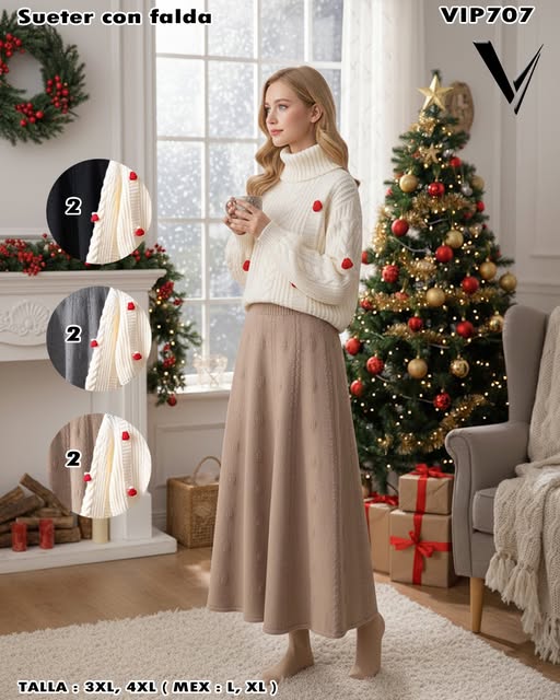 ✔️ Tela: suéter de punto grueso con pompones decorativos + falda de knit suave y cálida